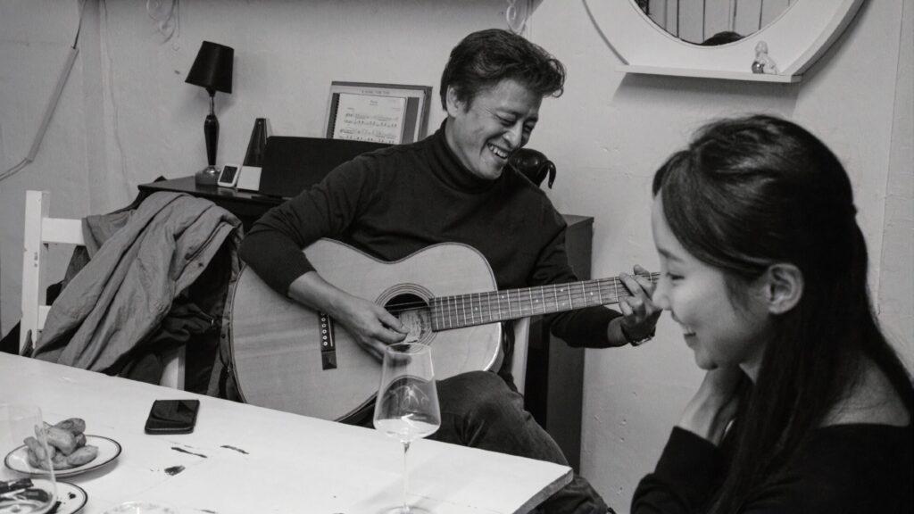 L’un des aspects les plus frappants, depuis quelques années maintenant dans son cinéma, est la radicalité de sa mise en scène qui prend de plus en plus d’ampleur. Plusieurs éléments formels témoignent, conjointement du processus et des éléments narratifs, d’un renouvellement esthétique, notamment ces scènes de dialogues en hors-champ. Postérieurement aux cinéastes ayant mis en pratique le non jeu d’acteur, afin d’éviter la manipulation émotionnelle du spectateur, Hong Sang-soo pousse plus loin en faisant de la non présence d’acteurs. Il n’y a plus aucune matérialisation de fiction, si ce n’est la voix, qui viendrait à l’encontre du regard porté sur le réel. Bien souvent d’ailleurs, quand un élan poétique éclot, celui-ci se rompt en étant subitement rattrapé par le réel. C’est le cas dans Walk Up avec la scène de guitare interrompue par le téléphone qui sonne, c’est le directeur du studio, c’est le travail qui le rattrape.